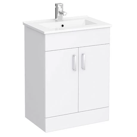 The stylish contemporary Bianco vanity unit suite, features a semi back to wall close coupled toilet with a top fix soft-close toilet seat and a 600mm minimalist high gloss white vanity unit with ceramic basin.