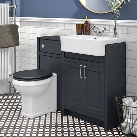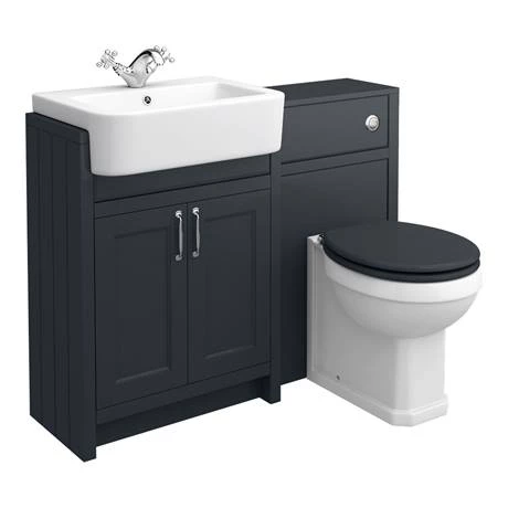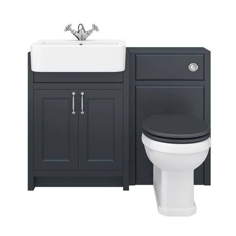 The Chatsworth traditional 600mm wide graphite vanity unit with a gloss white semi-recessed basin and wc unit package, Victorian inspired design with a modern twist. The Chatsworth range of charming bathroom furniture features classic styling with a satin white finish cabinet and tongue-and-groove side panelling. The semi recessed basin will half sit in your unit.