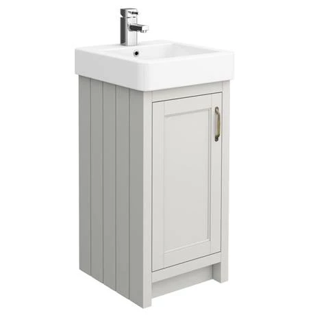 The Chatsworth traditional cloakroom suite features a stylish 425mm wide satin grey vanity unit with gloss white ceramic basin and a high-quality traditional close coupled toilet with matching satin grey seat.