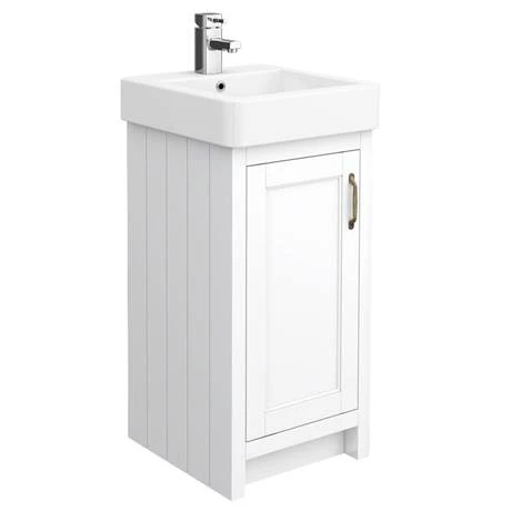 The Chatsworth traditional cloakroom suite features a stylish 425mm wide satin white vanity unit with gloss white ceramic basin and a high-quality traditional close coupled toilet with matching satin white seat.Â